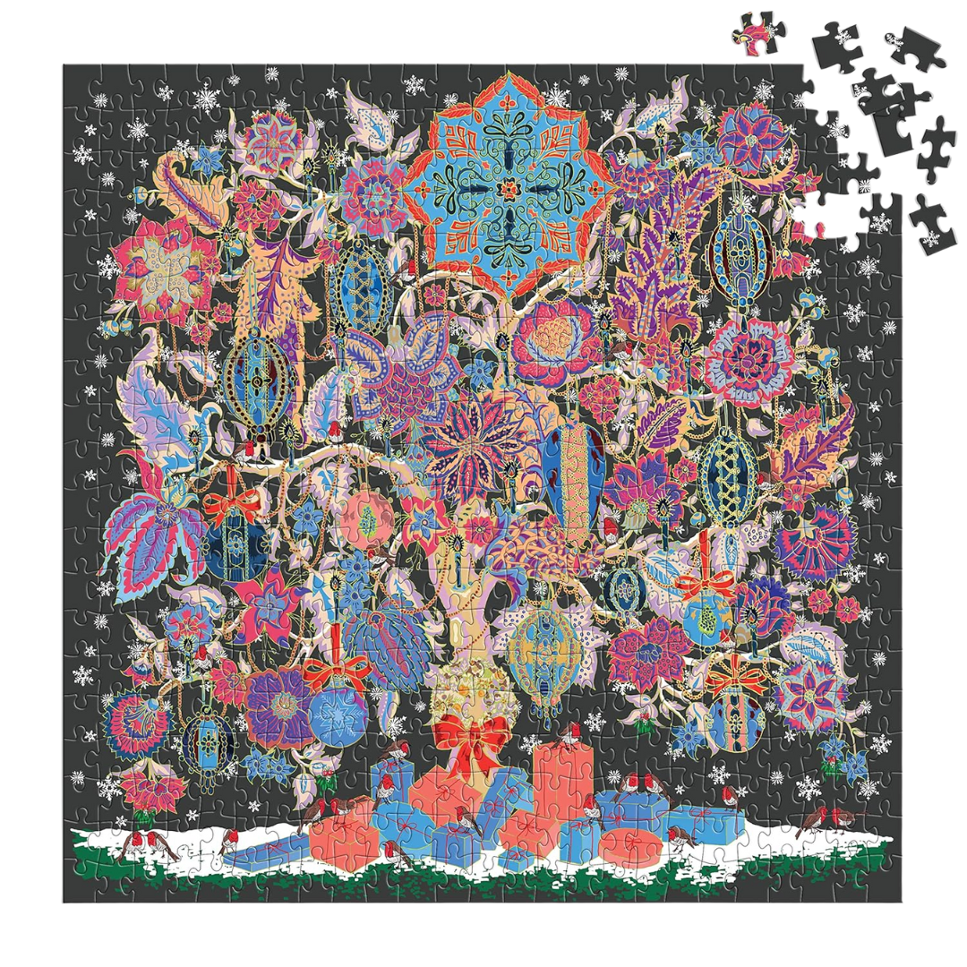 The Liberty Christmas Tree of Life 500 Piece Foil Puzzle from Galison features Liberty's festive holiday Tree of Life print, an ancient symbol of abundance. On this puzzle image, the tree is reimagined with Christmas baubles and presents for the Christmas season, with gold foil embellishments bringing out the exquisite details of this ornate composition. Galison puzzles are packaged in matte-finish sturdy boxes, perfect for gifting, reuse, and storage.